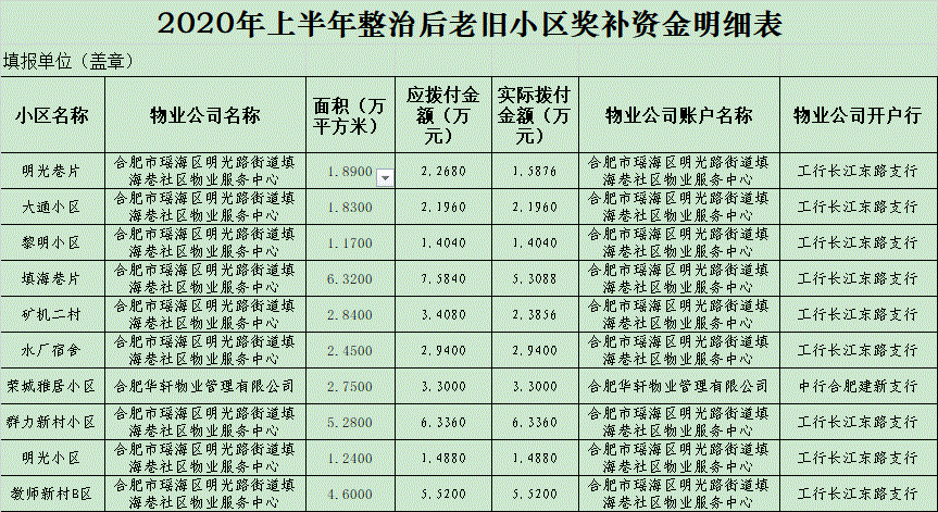 2020年上半年整治后老旧小区奖补资金明细表 |