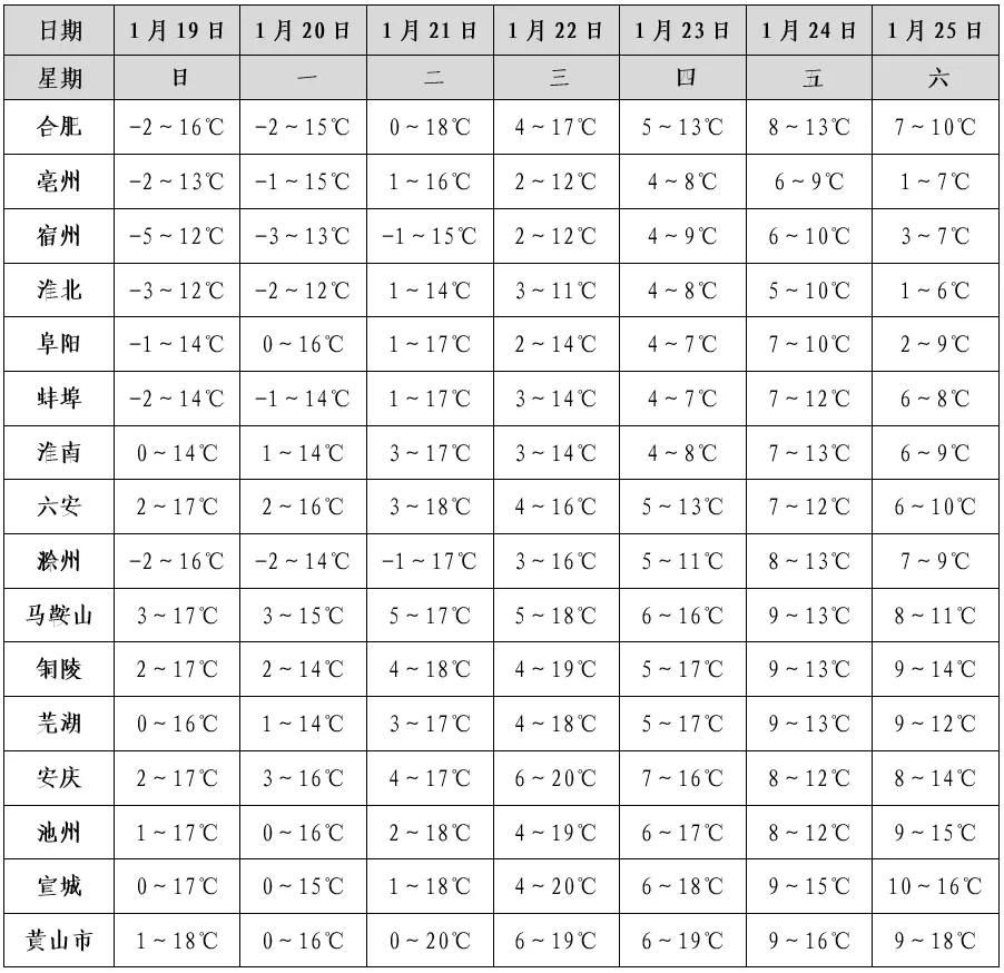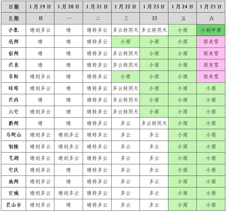 再看全省情况。据安徽省气象台预报,1月20日至21日,全省以晴到多云天气为主。22日夜间至25日,安徽有雨雪天气,其中25日夜间沿淮淮北和大别山区部分地区有小雨转雨夹雪或雪。
