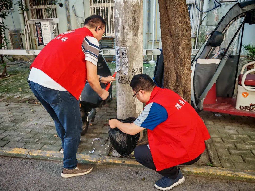 他们手持铲刀逐楼清理顽固广告,弯腰俯身捡拾绿化带隐蔽垃圾,将散落各处的废旧家具集中清运……汗水浸透的党徽在阳光下格外醒目。