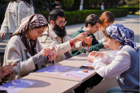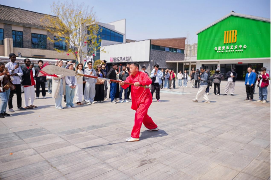 第三站,采风团来到青年创意田园。迎目是几乎无边的金色油菜花海,让惯于在“钢铁丛林”中穿梭的留学生们眼前一亮,“竟有这样美的自然风光,而且就在市区。”正是春时好景,学生们乘坐游览车,在讲解员的带领下观赏了园区的热门景点。在瑶海音乐厅门口广场上,采风团欣赏了非遗老师带来的大洪拳表演,还与老师“切磋一二”,点燃了热闹的氛围。