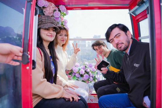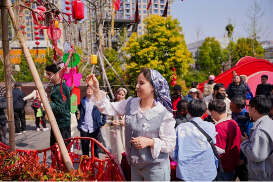 随后,采风团又驱车前往时埠里文旅街区游览参观。时埠里文旅街区不只是一个商业街,更是瑶海老工业基地成功焕新的生动样本。留学生们造访了工业时光记忆轴、网红打卡墙、老烟囱温度计等多处网红记忆符号。在许愿树下寄语美好心愿,在城市缆车中俯瞰合肥城区美景。时埠里兼具的老工业文化特色和现代创意元素,在留学生心中碰撞出别样的遐思,令一行人流连忘返。
