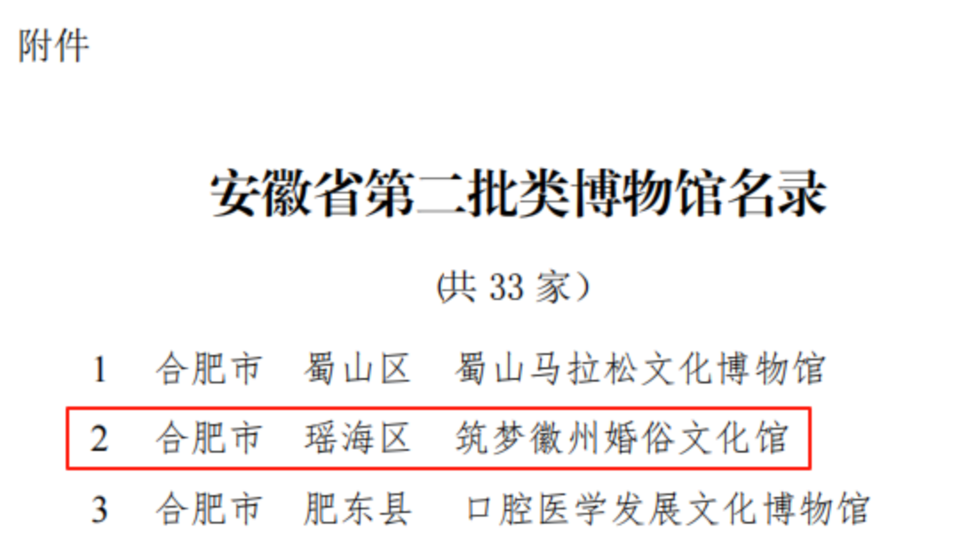 近日,省文物局公布安徽省第二批类博物馆名录,合肥市共有3家单位入选。由瑶海区推荐的筑梦徽州婚俗文化馆成功入选安徽省类博物馆培育库名录,成为瑶海区第2家省级类博物馆。