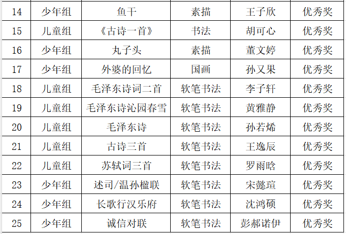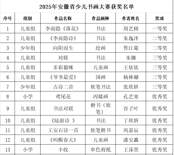 近日,安徽省文化馆公布2025年安徽省少儿书画大赛获奖名单,由瑶海区文化馆推荐选送的25名少儿书画作品获奖,其中一等奖1名,二等奖2名,三等奖4名,优秀奖18名,获奖名单如下: