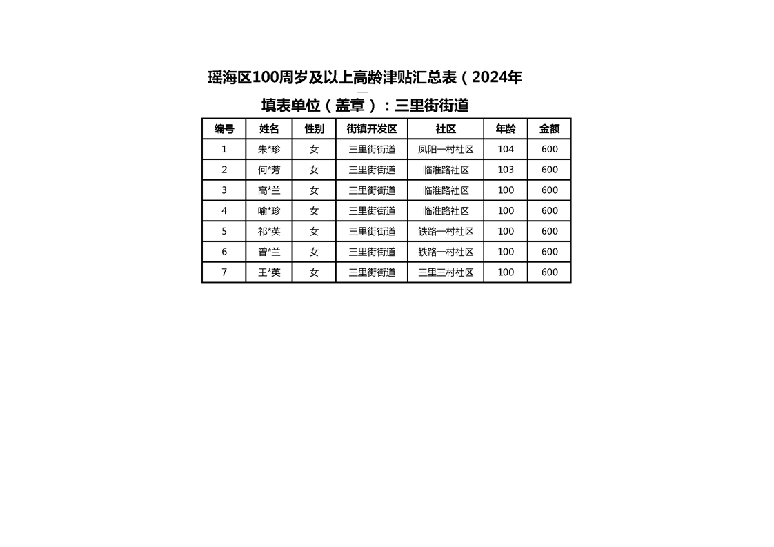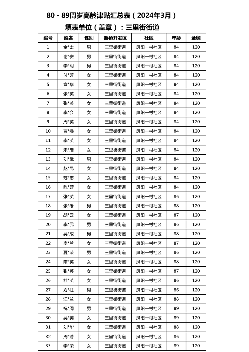 【分配结果】(2024年3月)三里街街道80周岁以上高龄津贴发放表