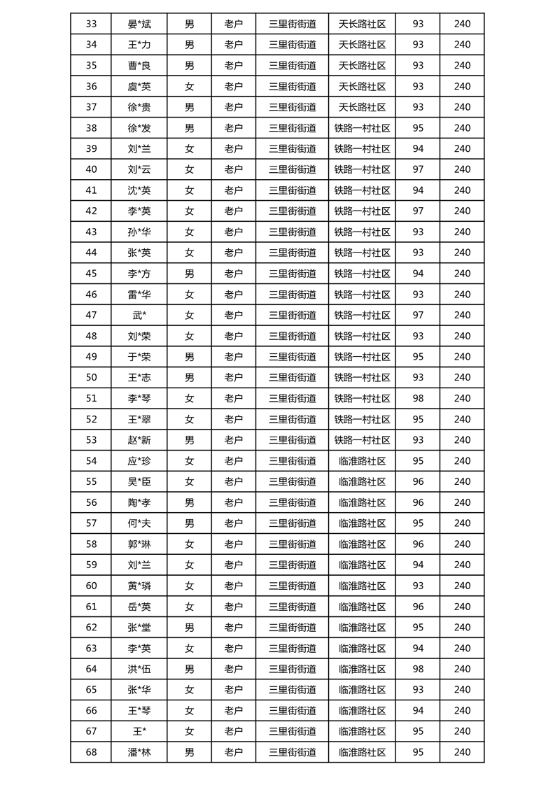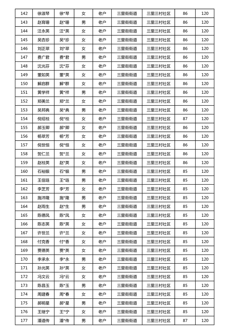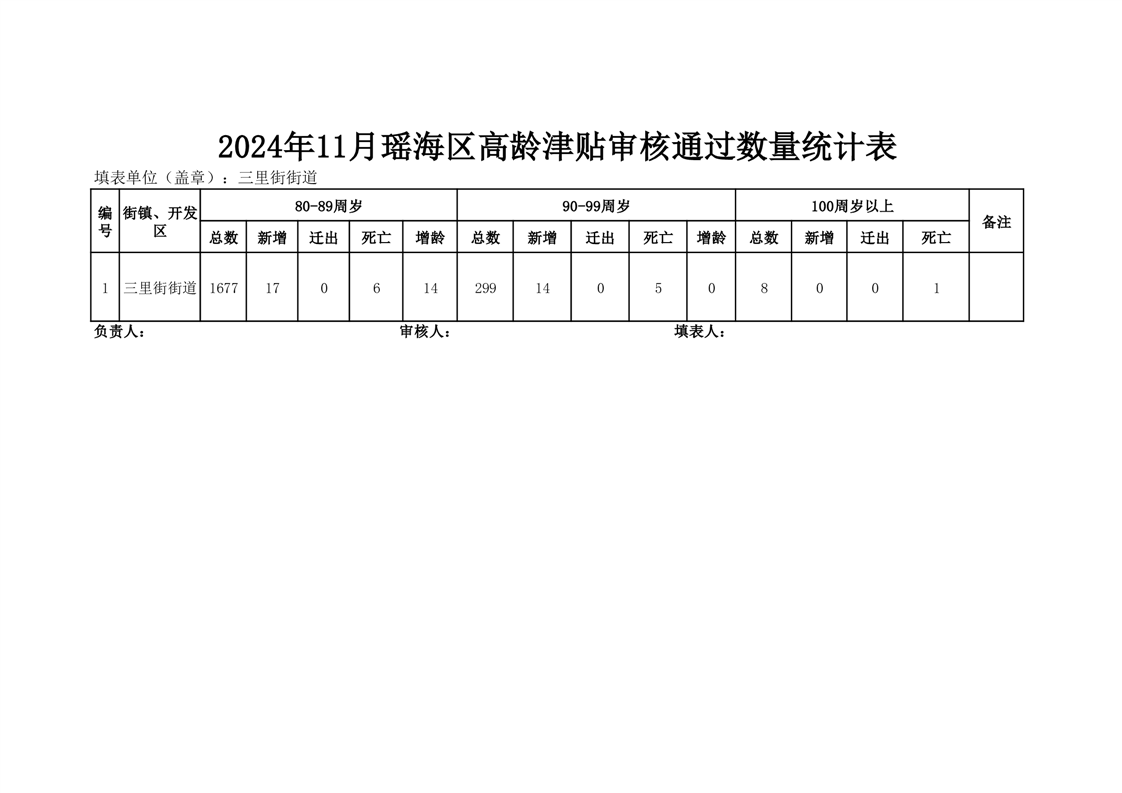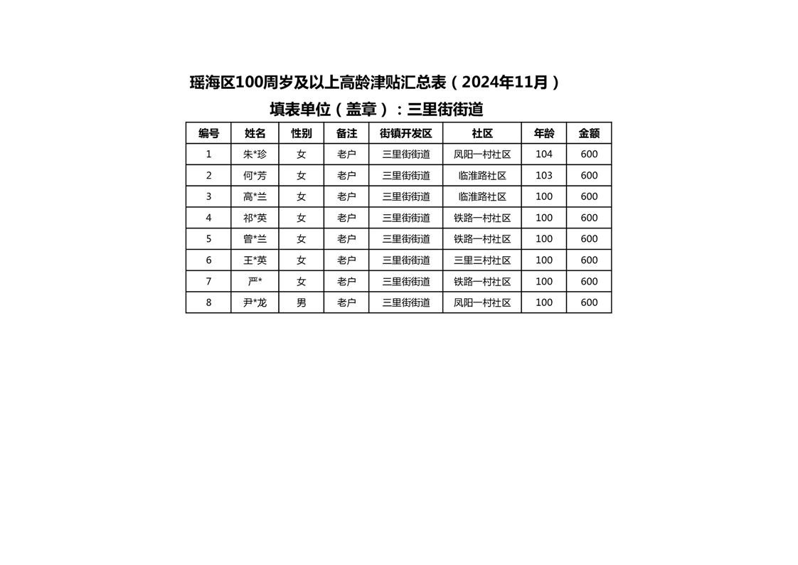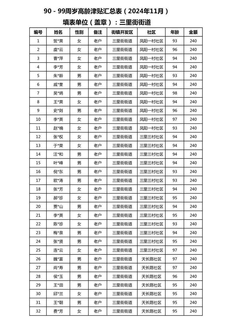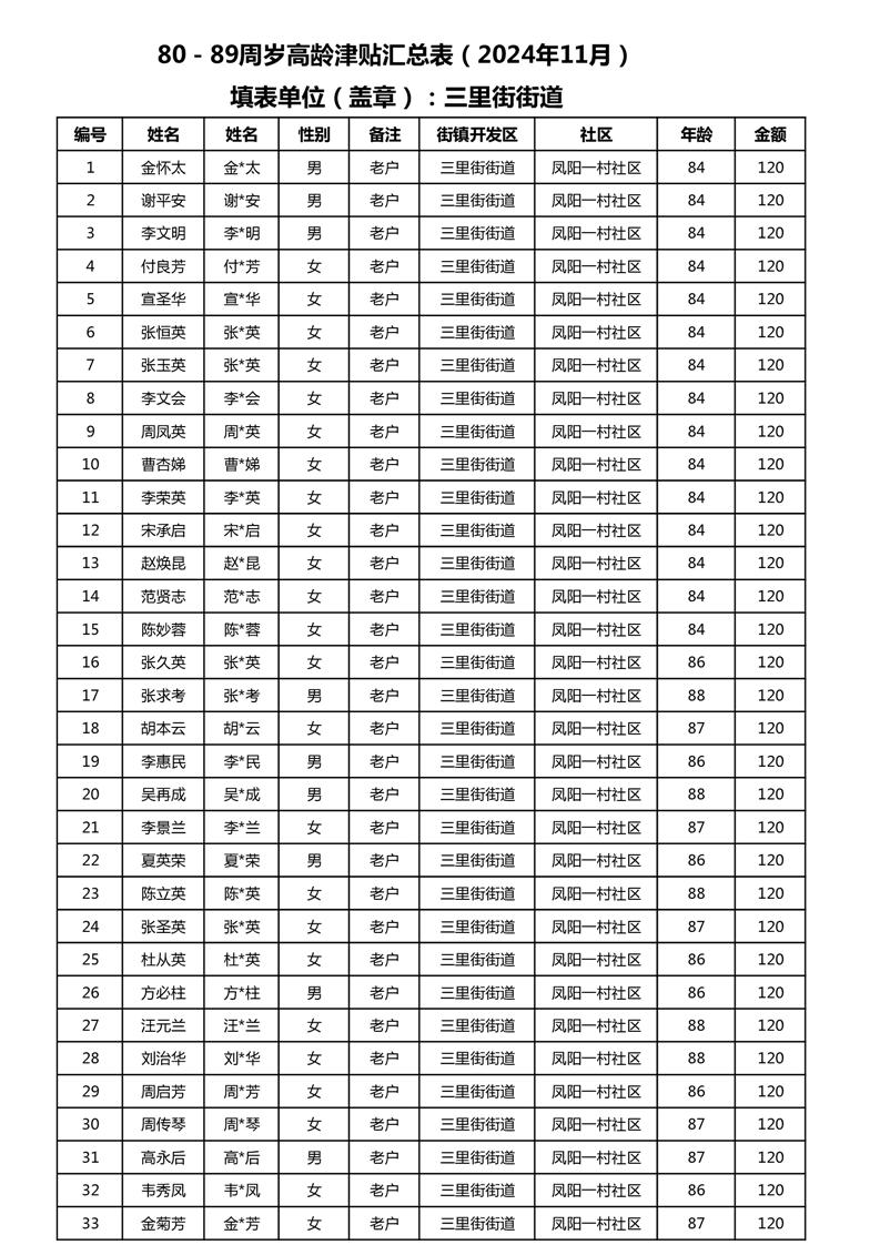 【分配结果】(2024年11月)三里街街道80周岁以上高龄津贴发放表