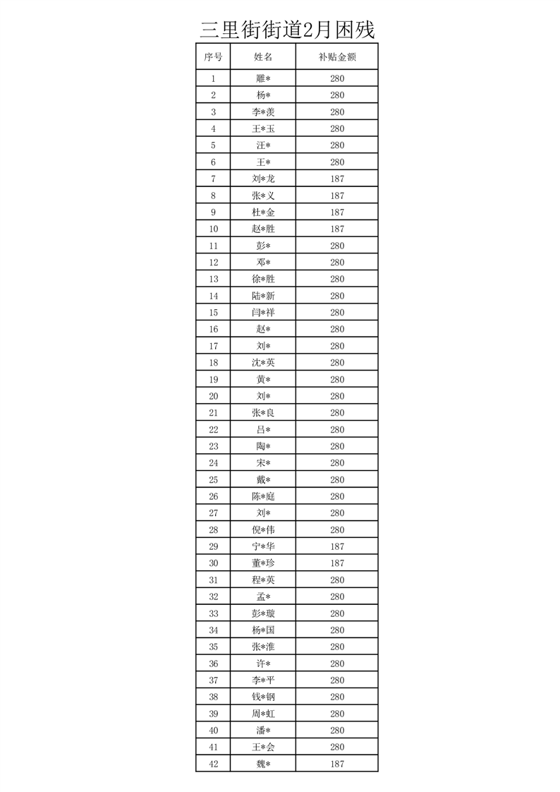 【分配结果】(2025年2月)三里街街道困难残疾人生活补贴发放表 |