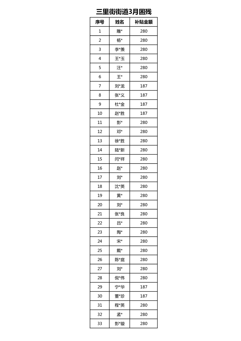 【分配结果】(2025年3月)三里街街道困难残疾人生活补贴发放表 |