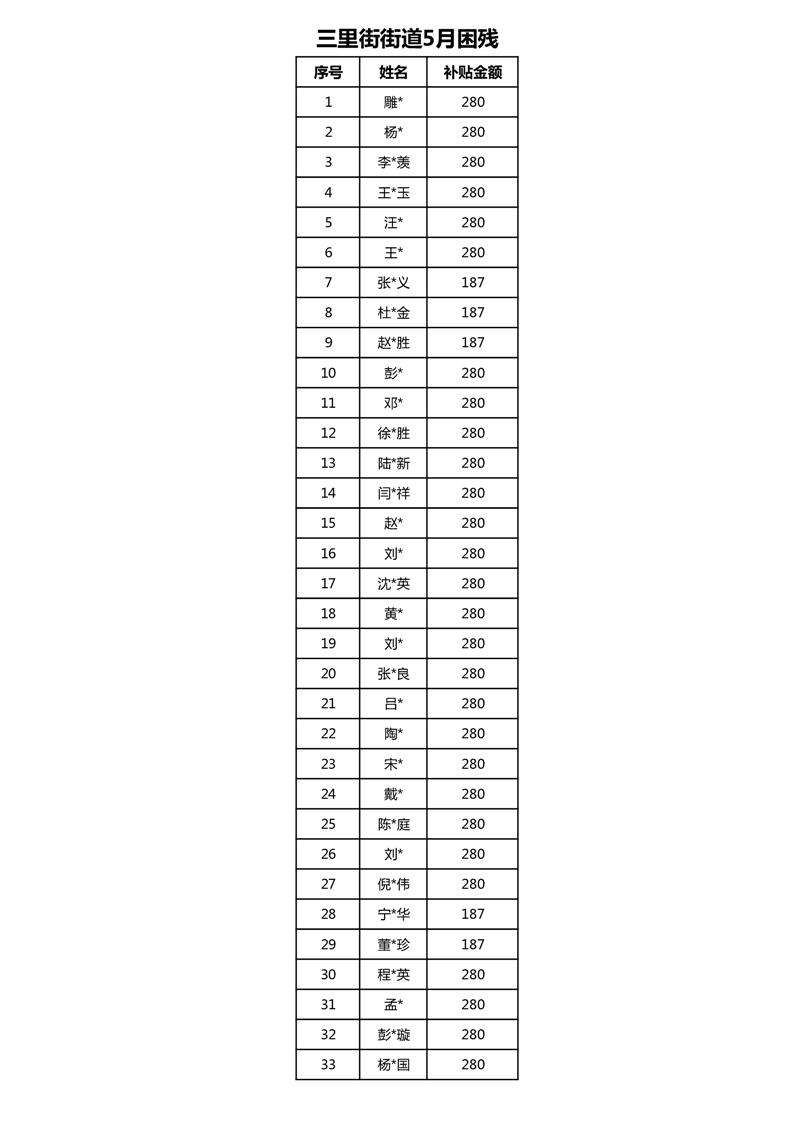 【分配结果】(2025年5月)三里街街道困难残疾人生活补贴发放表 |