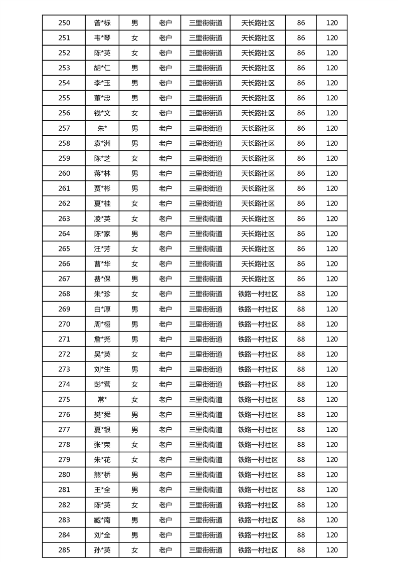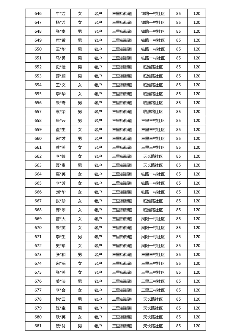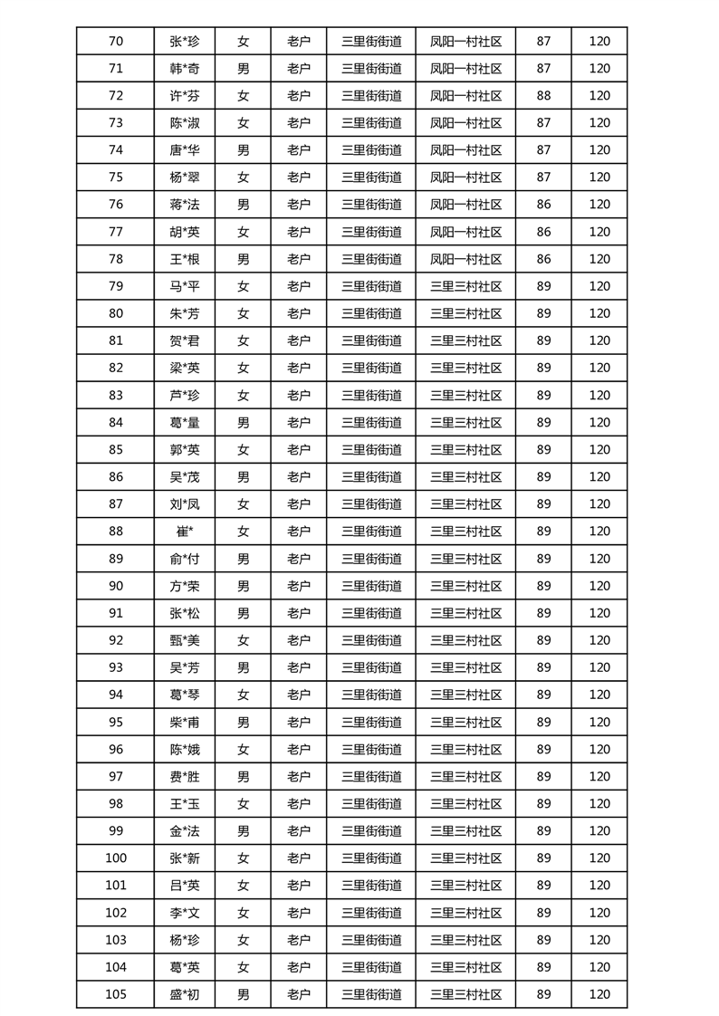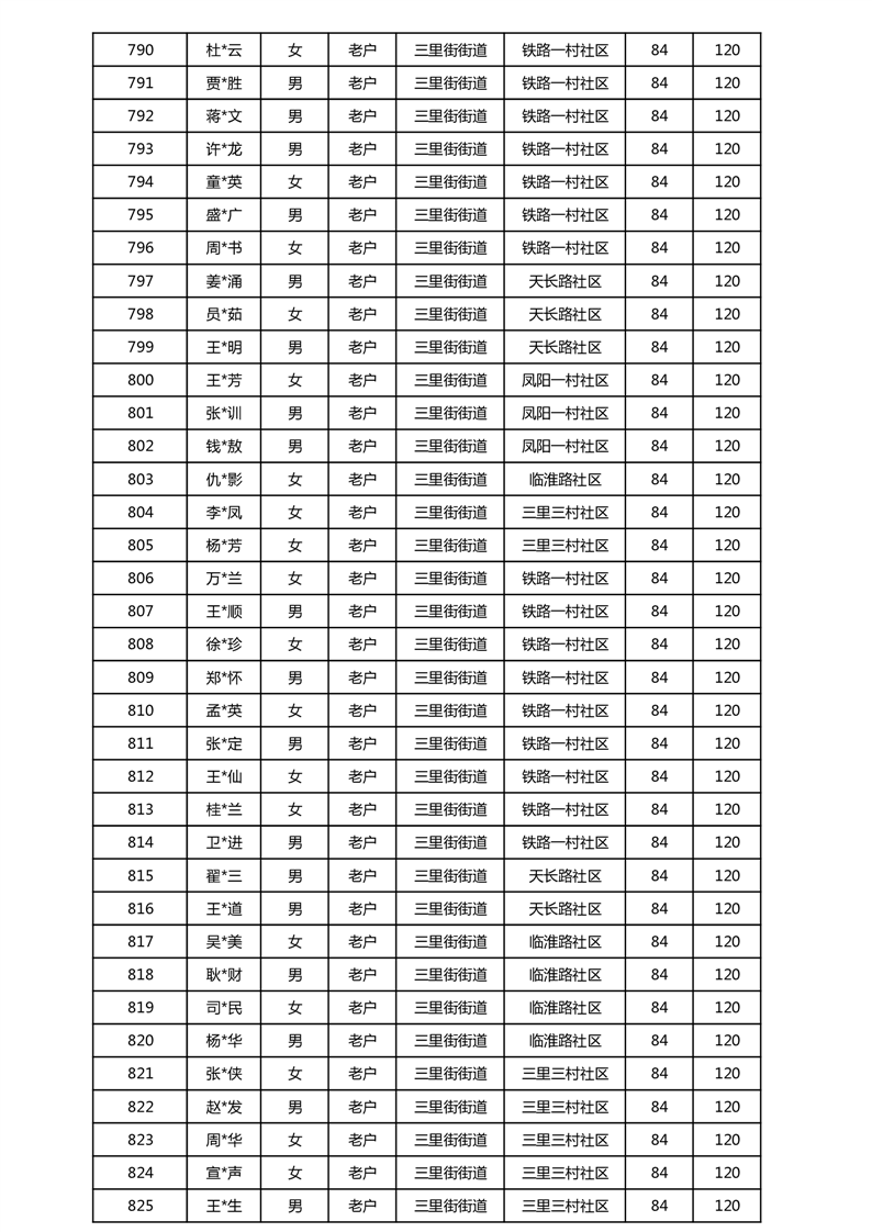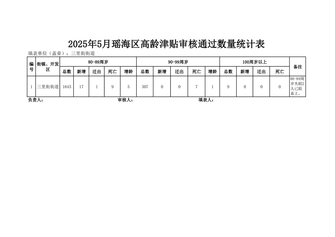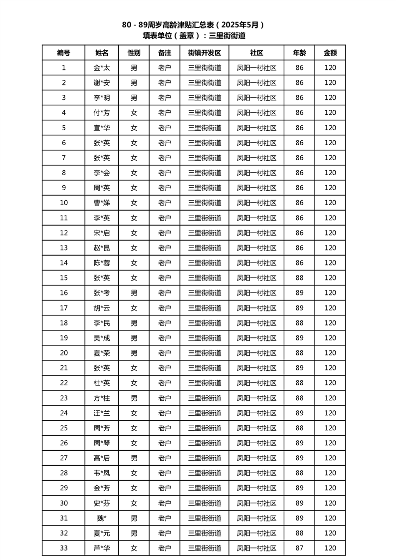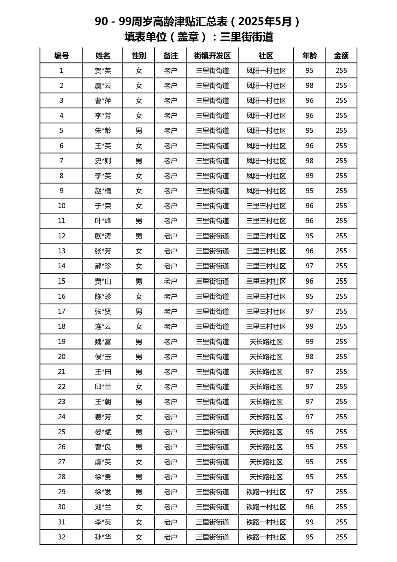 【分配结果】(2025年5月)三里街街道80周岁以上高龄津贴发放表