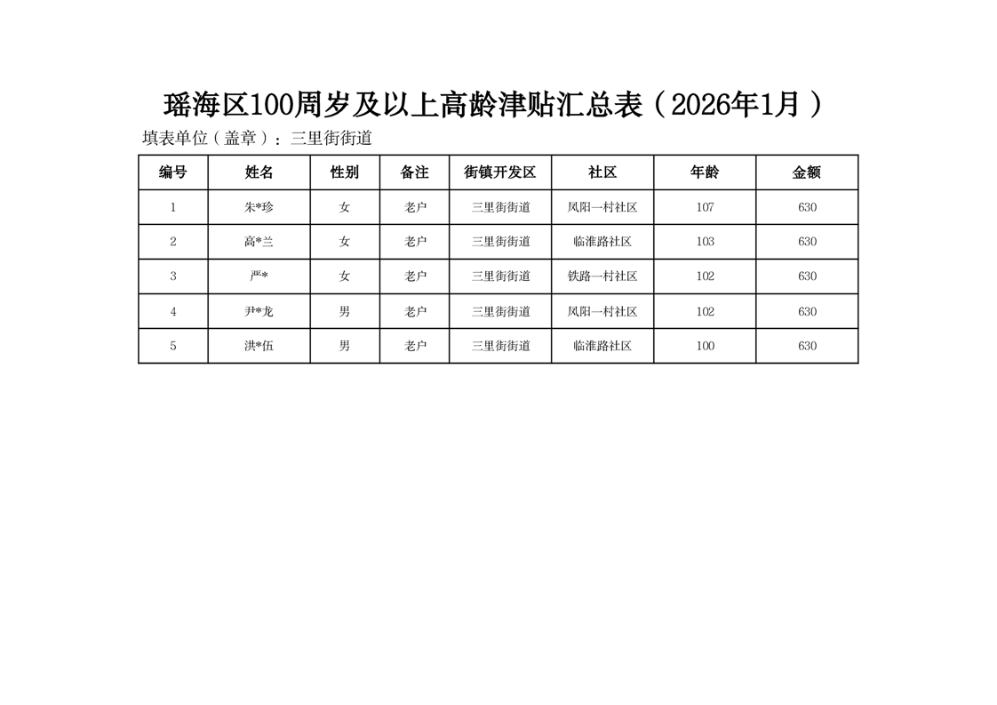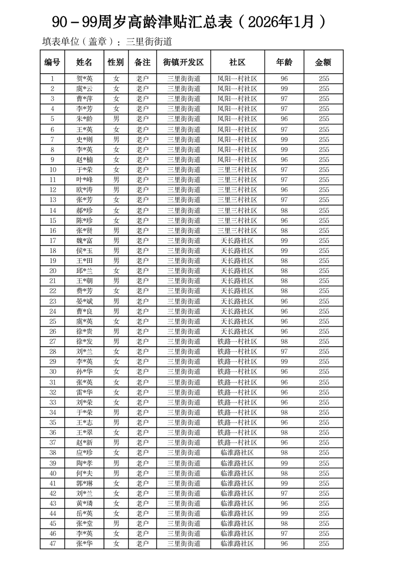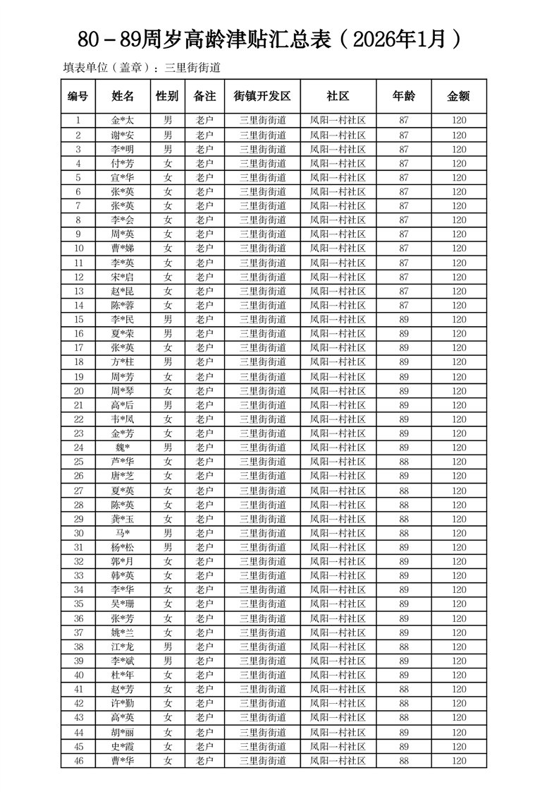 【分配结果】(2026年1月)三里街街道80周岁以上高龄津贴发放表