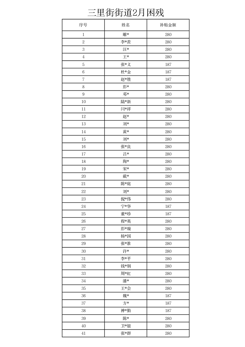 【分配结果】(2026年2月)三里街街道困难残疾人生活补贴发放表 |