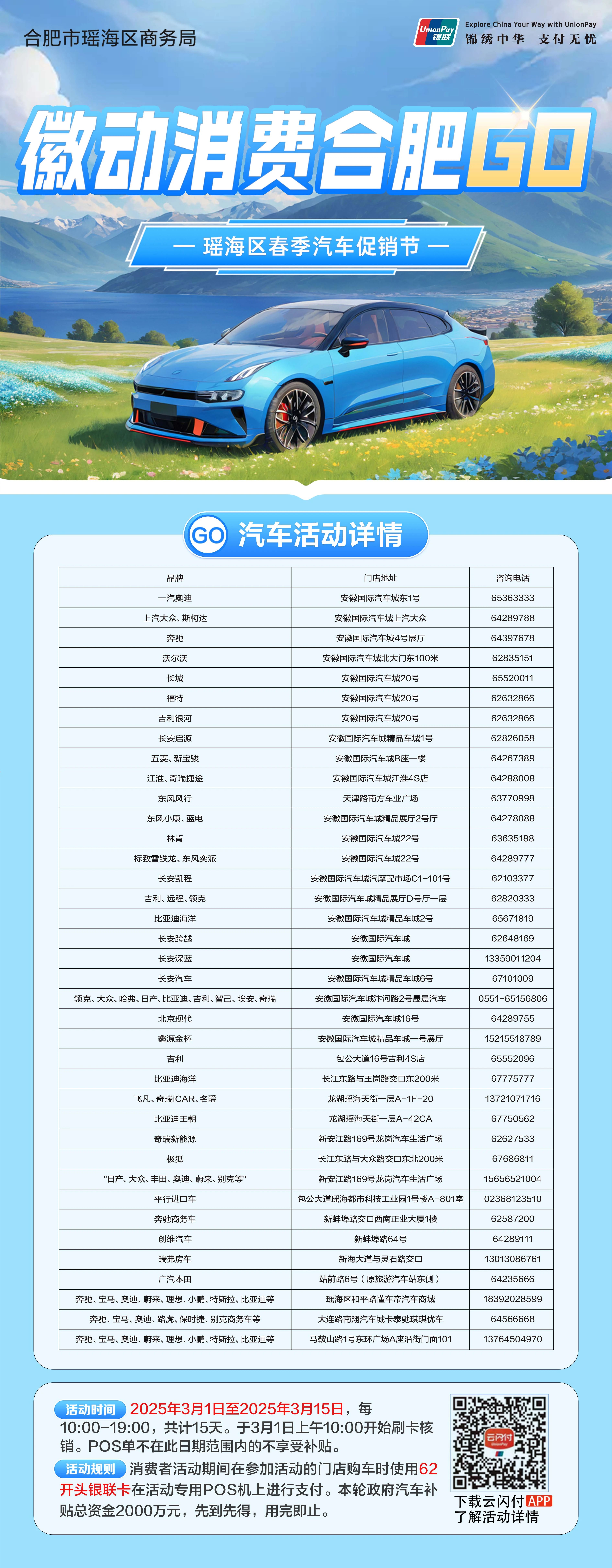 本次促销活动是瑶海区2025“徽动消费·合肥GO”主题活动的开年重头戏,更是历年补贴力度最大的一次!以前所未有的优惠力度直接补贴每一位购车者,进一步提振消费信心。下一步,瑶海区将持续开展系列促销活动,推动消费品“以旧换新”政策不断扩围,精准化满足消费者需求,以切实福利惠及广大消费者。