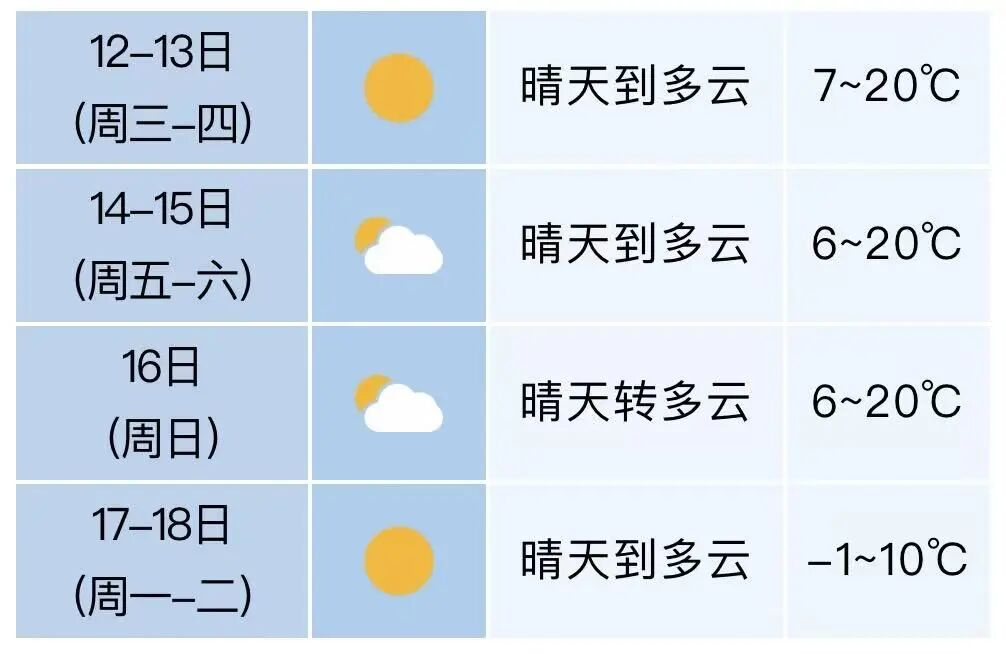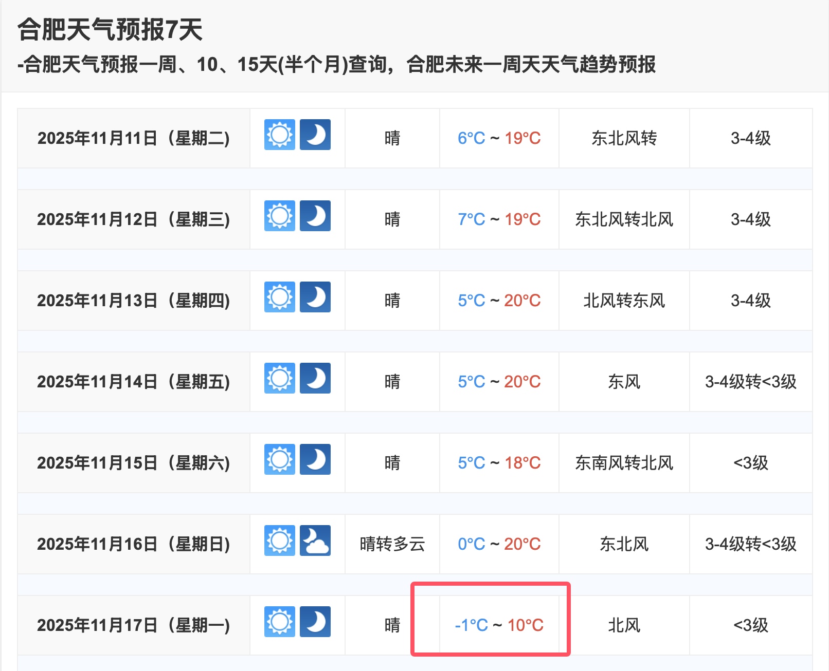 安徽气象台预报未来一周全省以多云到晴天气为主仅12日江南南部局部有小雨14日早晨淮河以北和本省山区有霜或霜冻15日前全省气温起伏不大最高气温普遍在16~18℃局部19~21℃16-18日受强冷空气影响我省有一次大风和降温过程全省平均气温将下降7~9℃局部超过10℃ 以合肥为例下周一(17日)最低气温降到-1℃