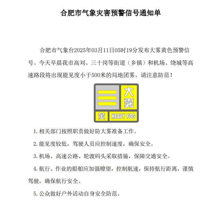 【自然灾害类】合肥市气象台2025年03月11日05时19分发布大雾黄色预警信号