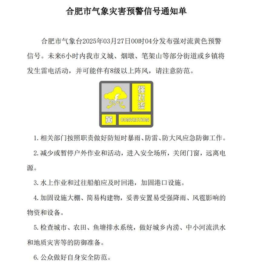 【自然灾害类】合肥市气象台2025年03月27日00时04分发布强对流黄色预警信号 |