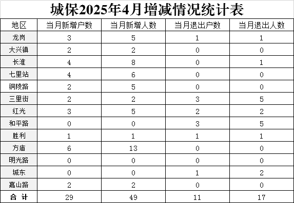 瑶海区城区低保增减情况统计表(2025年4月) |