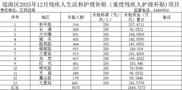 瑶海区2025年12月重度残疾人护理补贴项目公示表 |