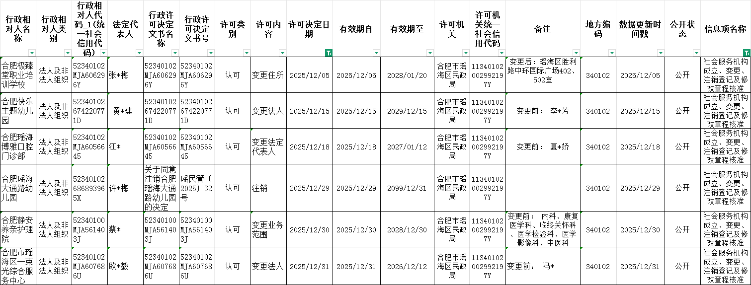 区民政局2025年12月份民办非企业成立、变更、注销审批情况
