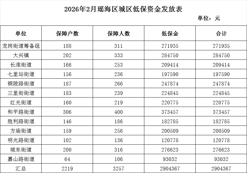 2026年2月瑶海区城区低保资金发放表 |