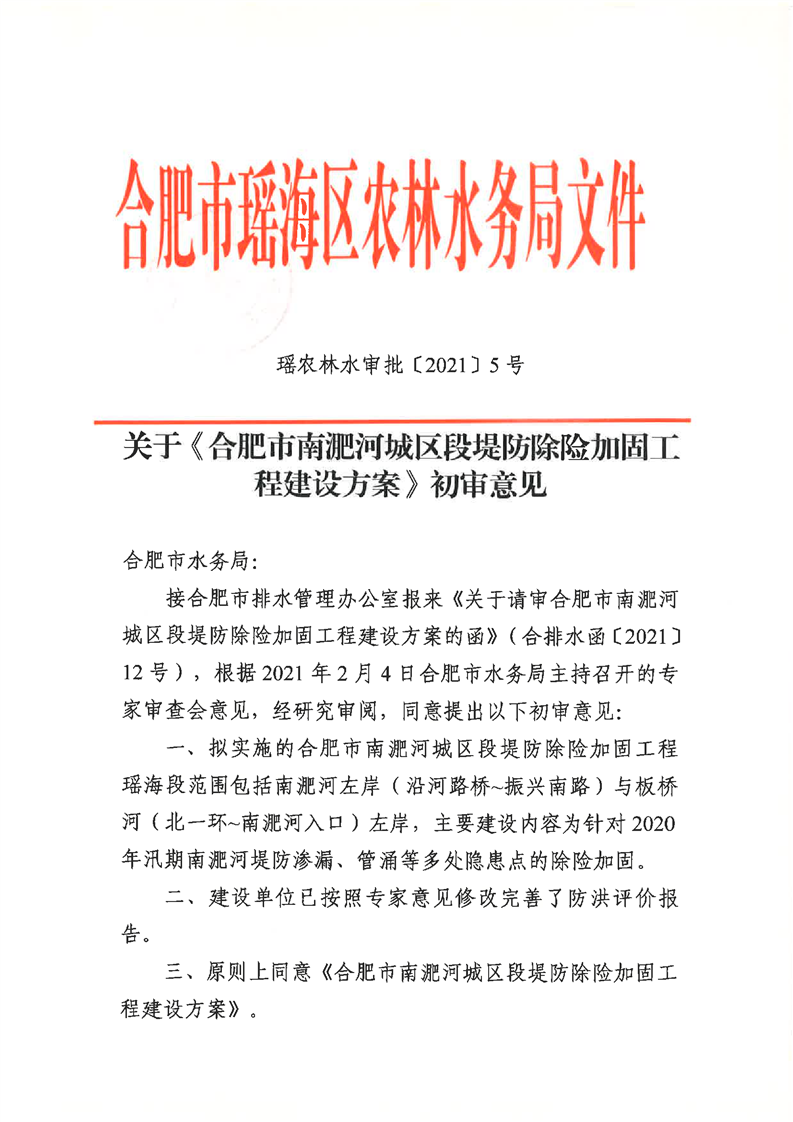 瑶农林水审批〔2021〕5号关于《合肥市南淝河城区段堤防除险加固工程建设方案》初审意见