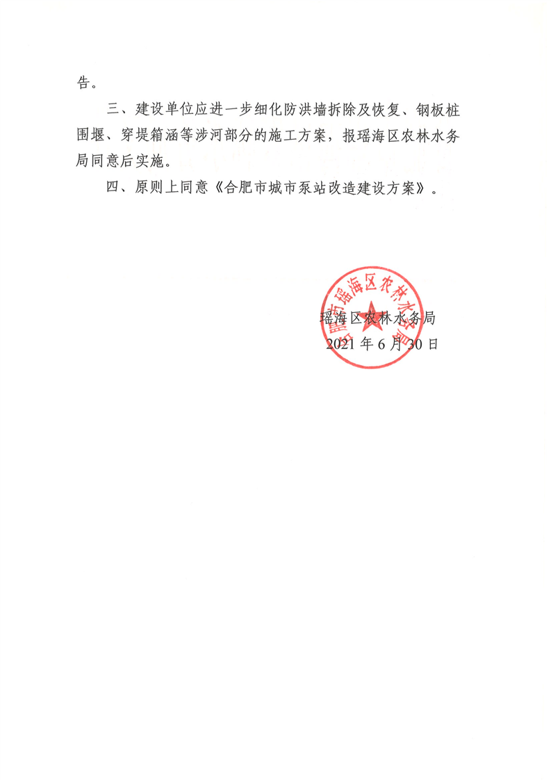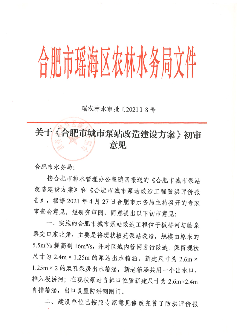 关于《合肥市城市泵站改造建设方案》初审意见
