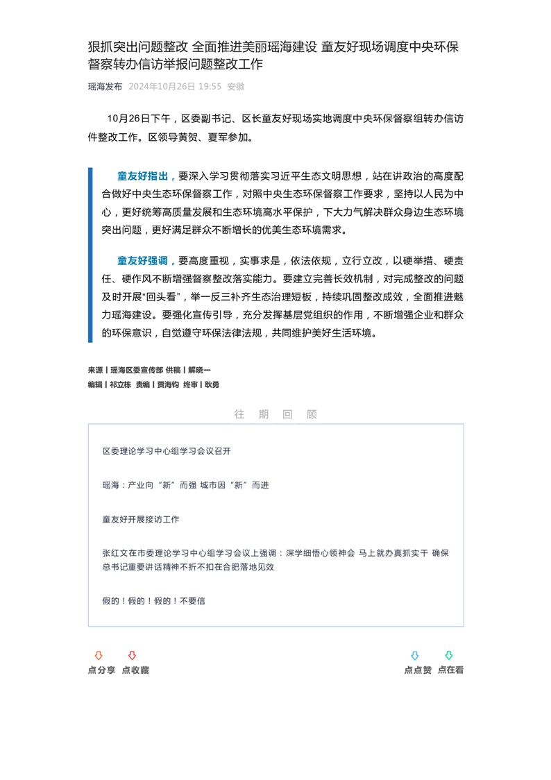 【工作推进】狠抓突出问题整改全面推进美丽瑶海建设童友好现场调度中央环保督察转办信访举报问题整改工作