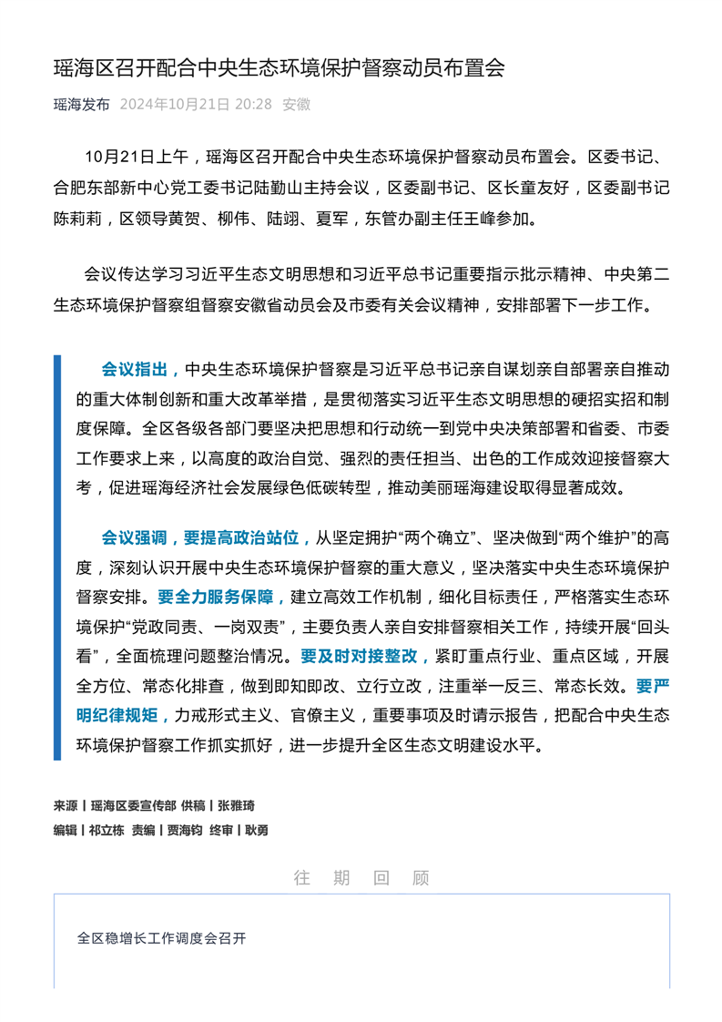 【工作推进】瑶海区召开配合中央生态环境保护督察动员布置会 |