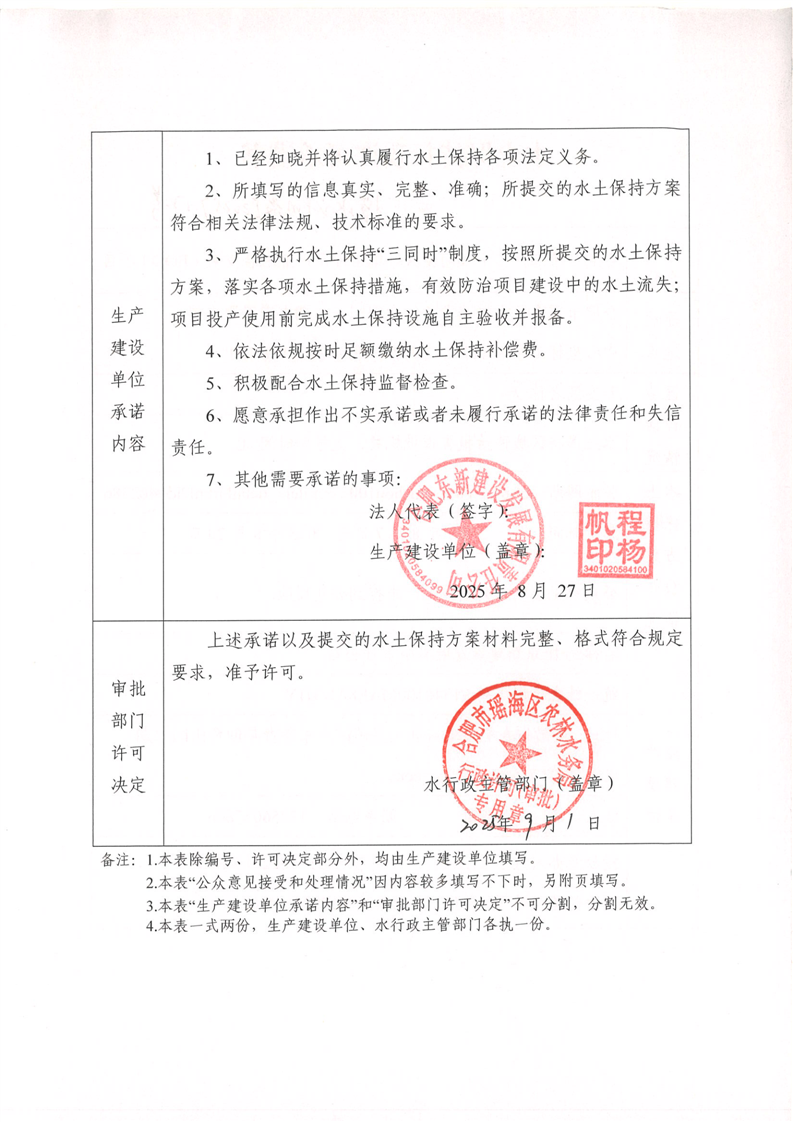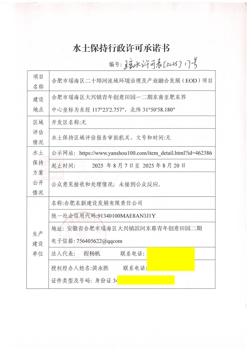 水土保持行政许可承诺书〔2025〕17号:合肥市瑶海区二十埠河流域环境治理及产业融合发展(EOD)项目 |