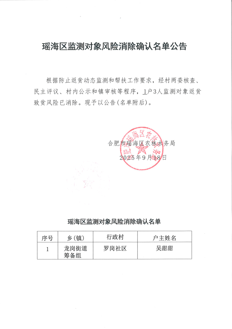 瑶海区监测对象风险消除确认名单公告-龙岗吴甜甜家庭