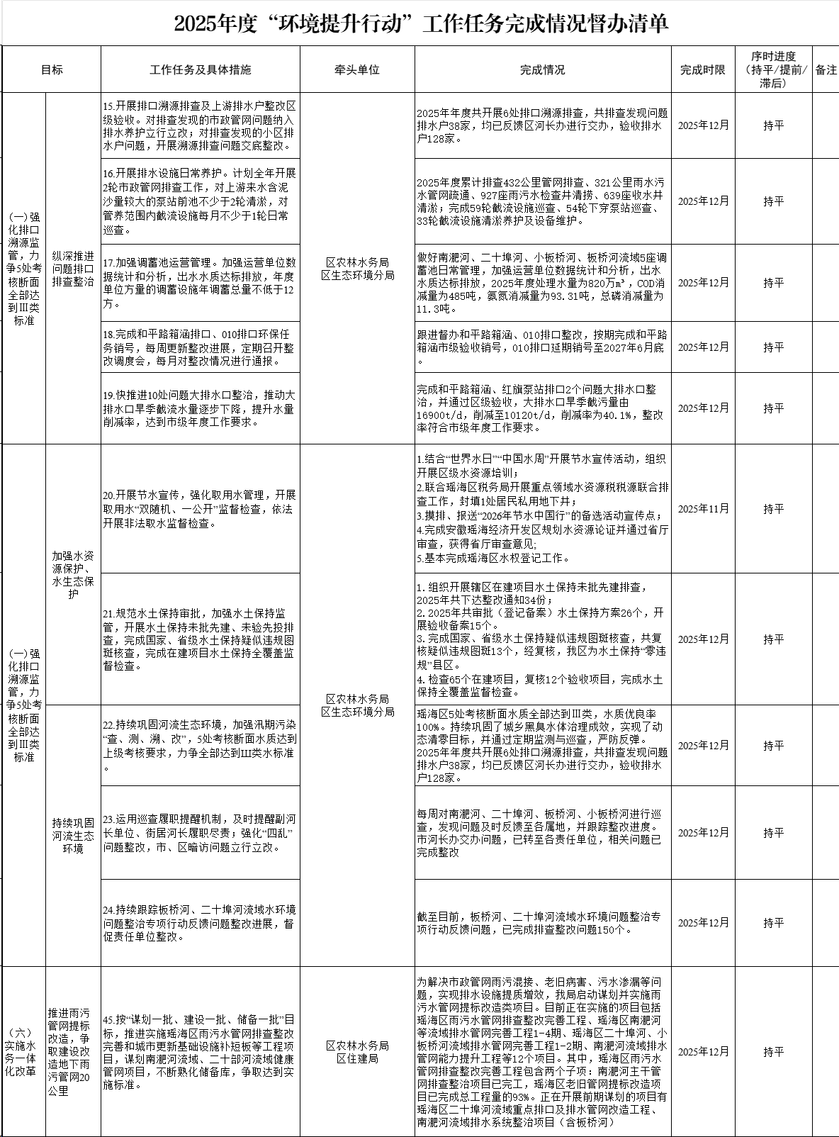 【决策落实】瑶海区农林水务局2025年度“环境提升行动”工作任务完成情况(1-12月份) |