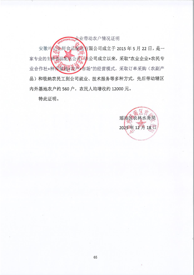 企业带动农户情况证明(安徽叶记生鲜食品配送有限公司) |