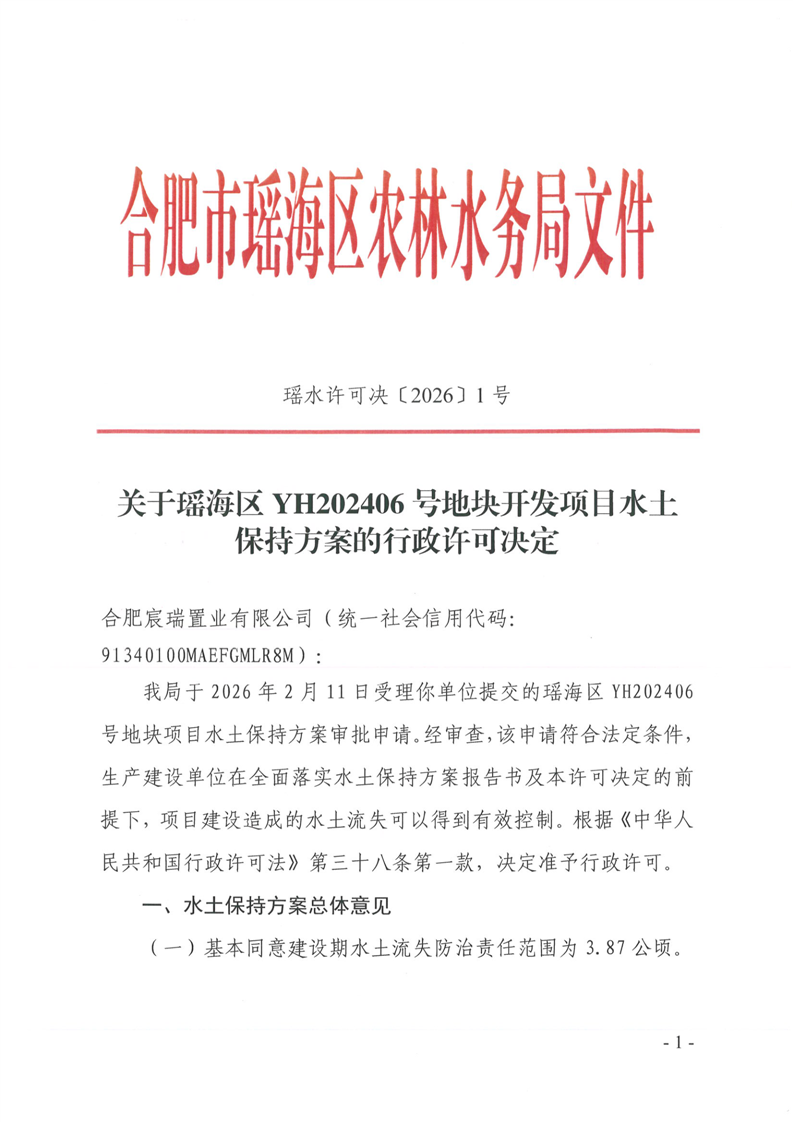 水土保持行政许可决定〔2026〕1号:瑶海区202406号地块开发项目