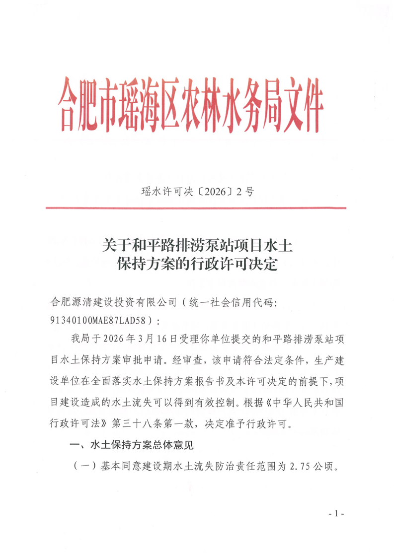 水土保持行政许可决定〔2026〕2号:和平路排涝泵站项目 |