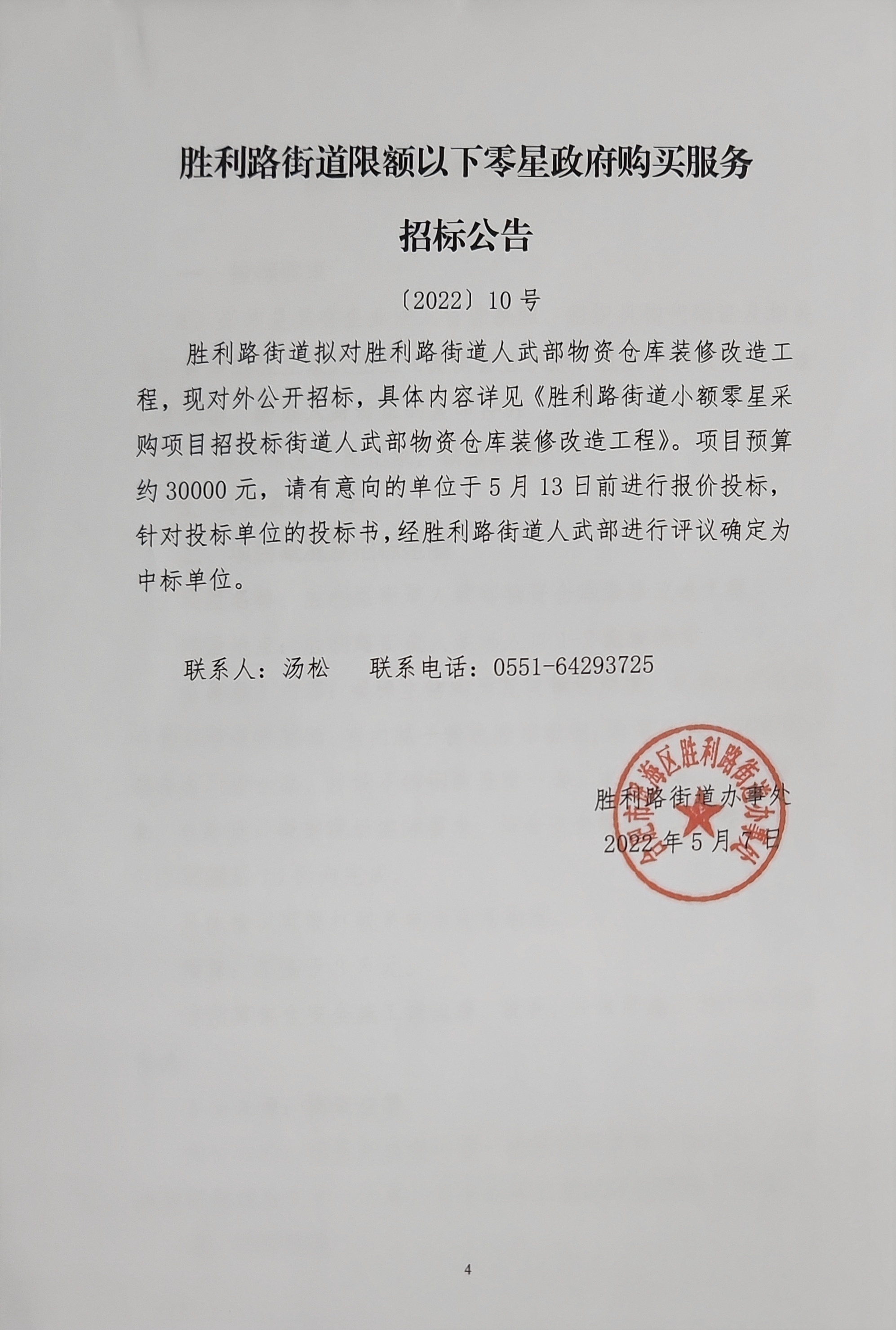 2022年第10号胜利路街道限额以下零星政府购买服务招标公告