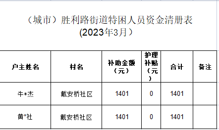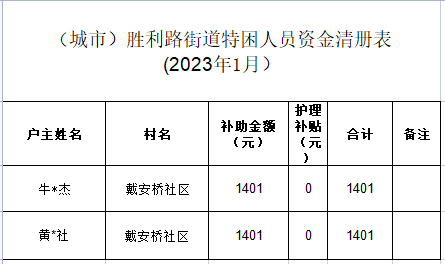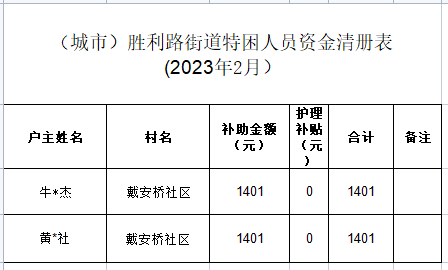 胜利路街道2023年第一季度特困供养人员补助分配情况 |