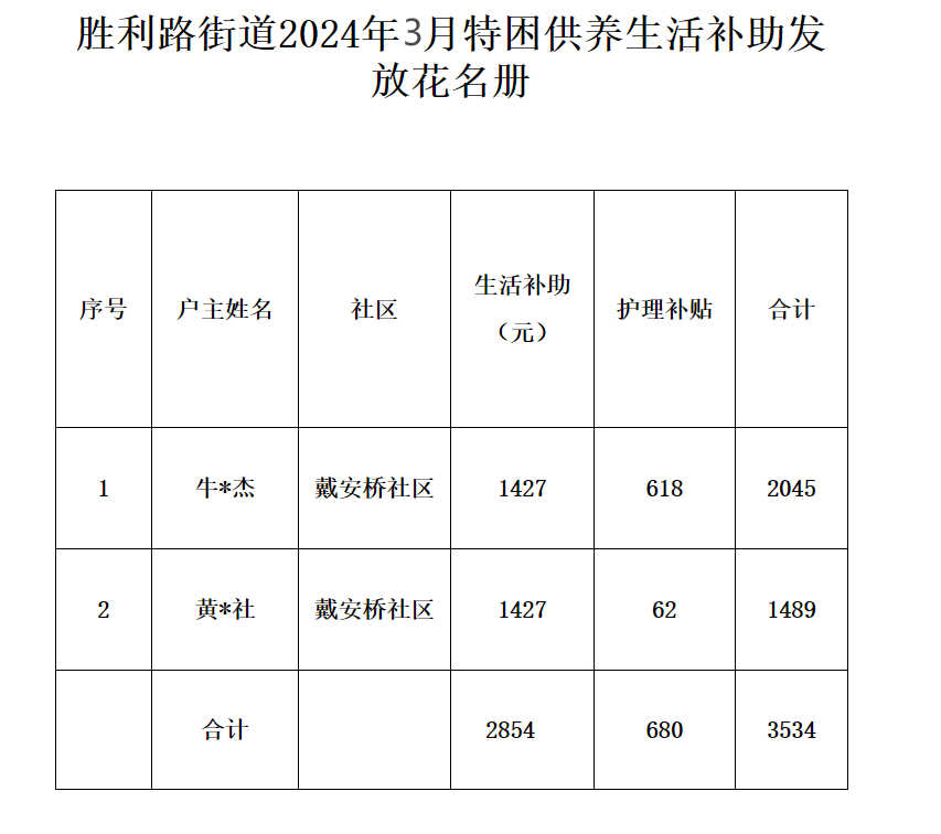 | 胜利路街道2024年1月特困供养生活补助发放花名册 |