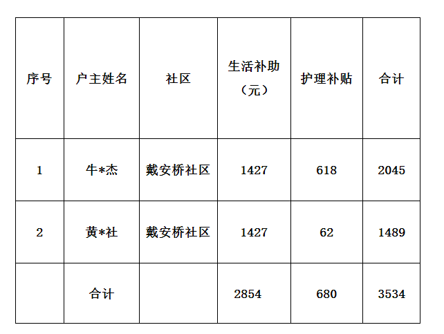 胜利路街道2024年8月特困供养生活补助发放花名册
