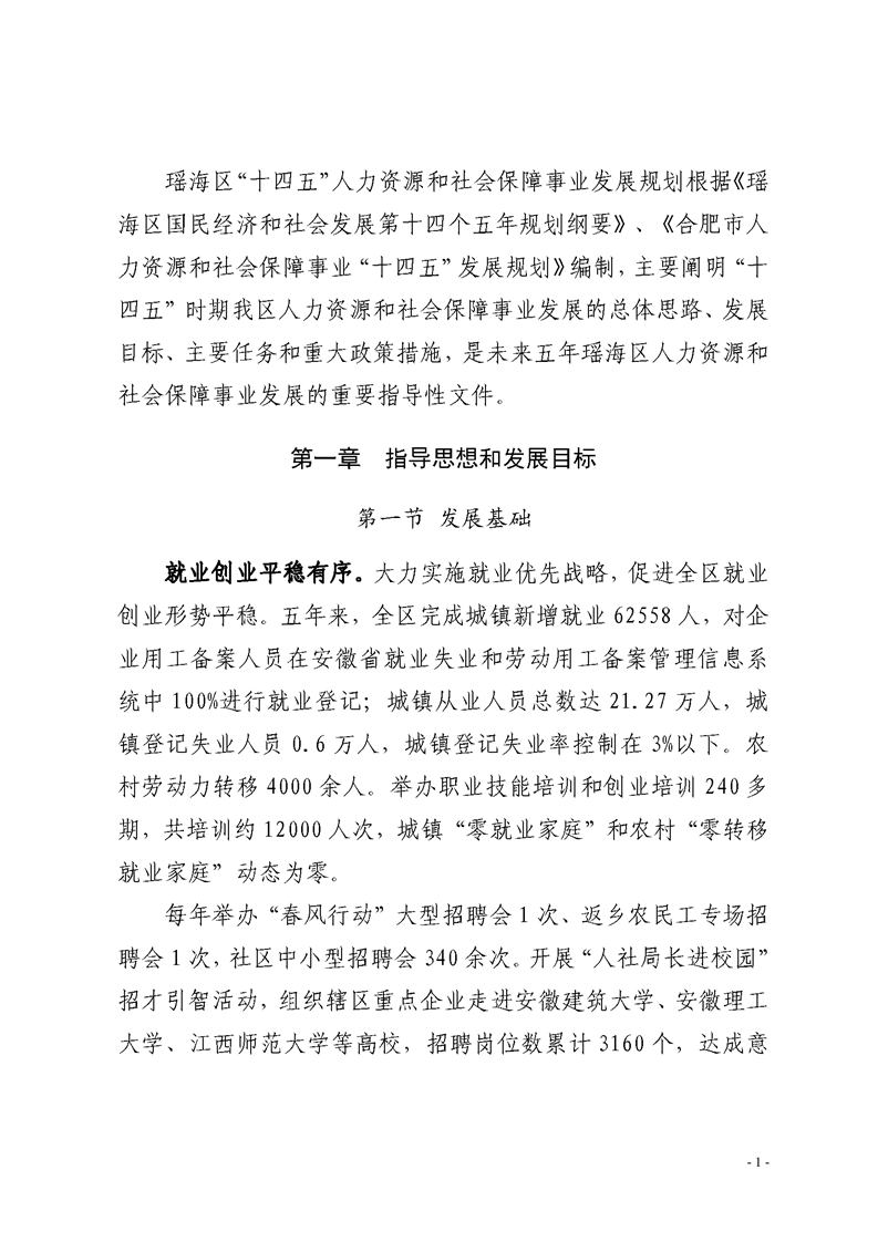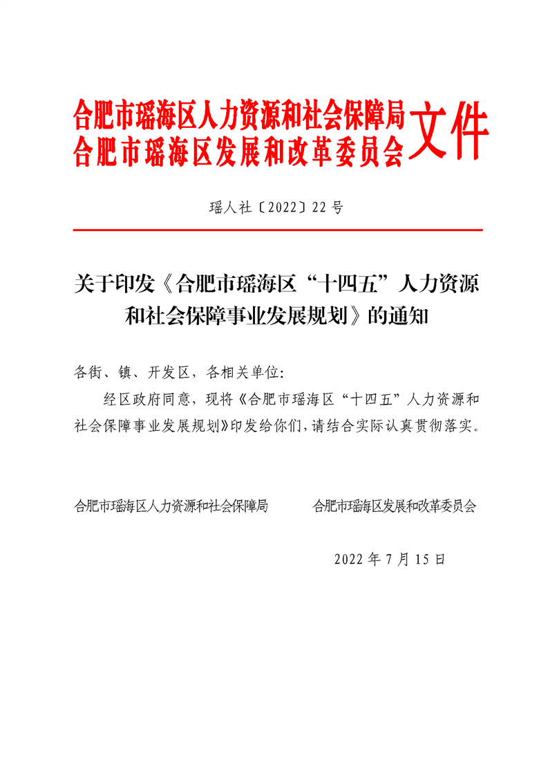 【上级文件】关于印发《合肥市瑶海区“十四五”人力资源和社会保障事业发展规划》的通知