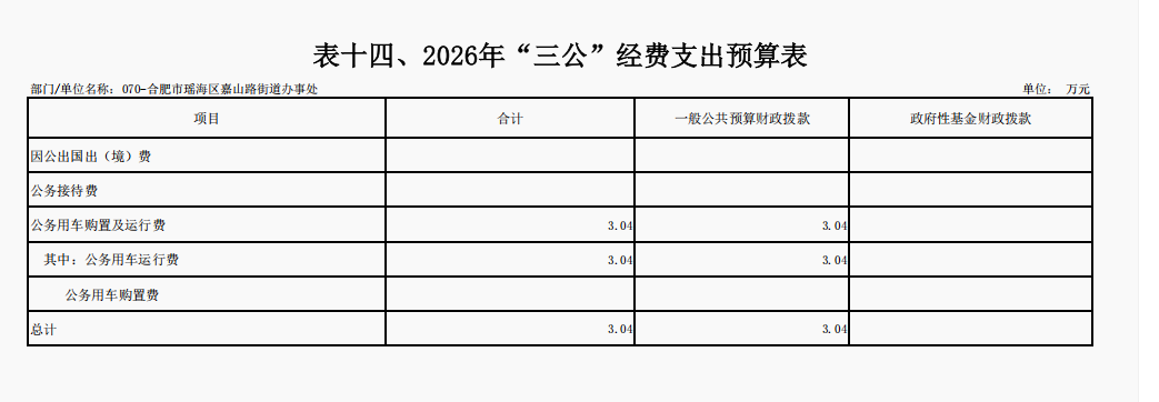 2026年,瑶海区嘉山路街道一般公共预算及政府性基金财政拨款“三公”经费支出预算3.04万元,与2025年相比持平。其中因公出国(境)费0.00万元,公务接待费0.00万元,公务用车购置及运行费3.04万元。具体情况如下: