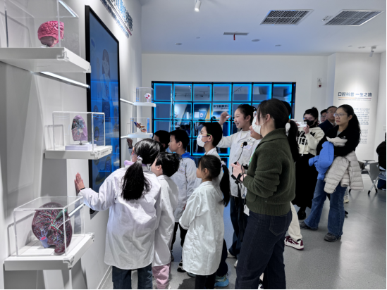 活动伊始,孩子们在医护人员的带领下参观了牙齿博物馆,馆内展示了详细的牙齿解剖模型及发育过程,帮助孩子们直观了解牙齿的结构、乳牙和恒牙的变化等知识。通过这一沉浸式学习,孩子们对牙齿的健康有了初步的认识,许多孩子纷纷提问,展现出对口腔健康知识的浓厚兴趣。