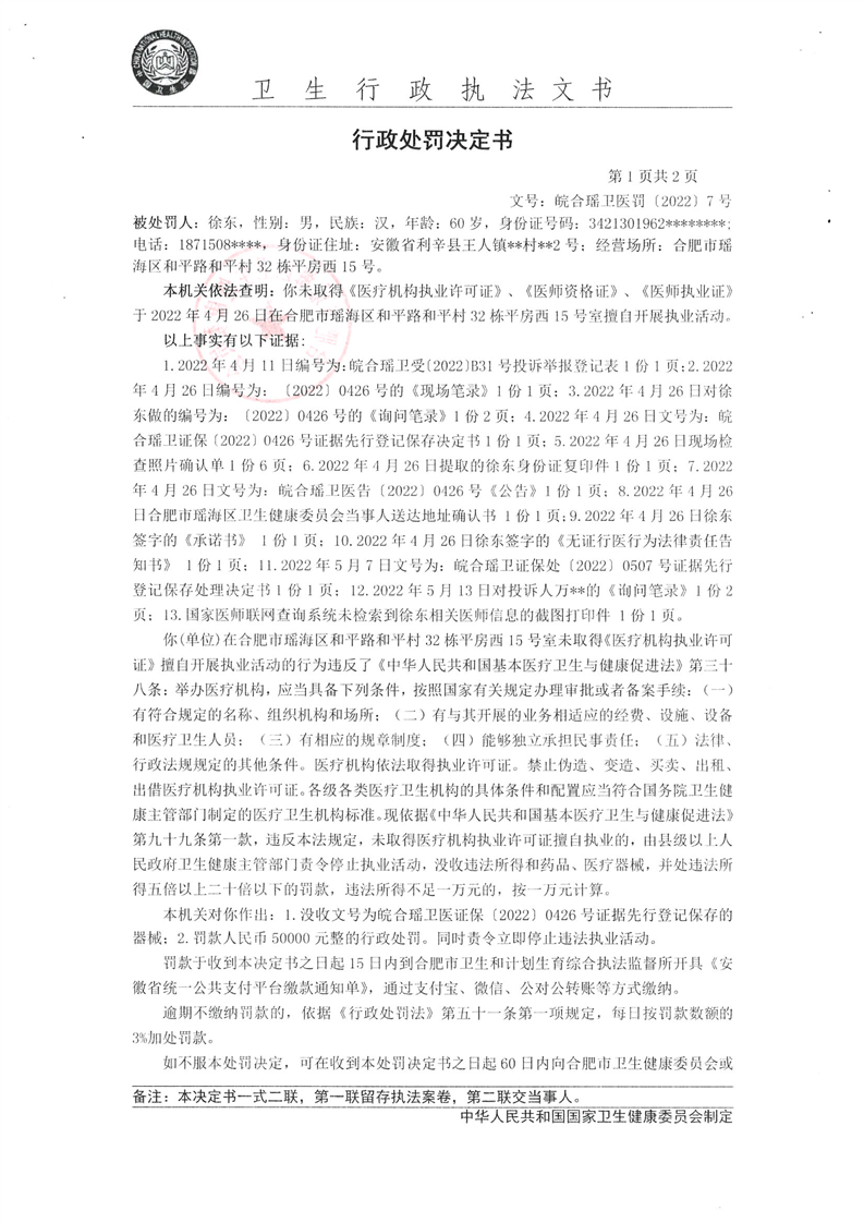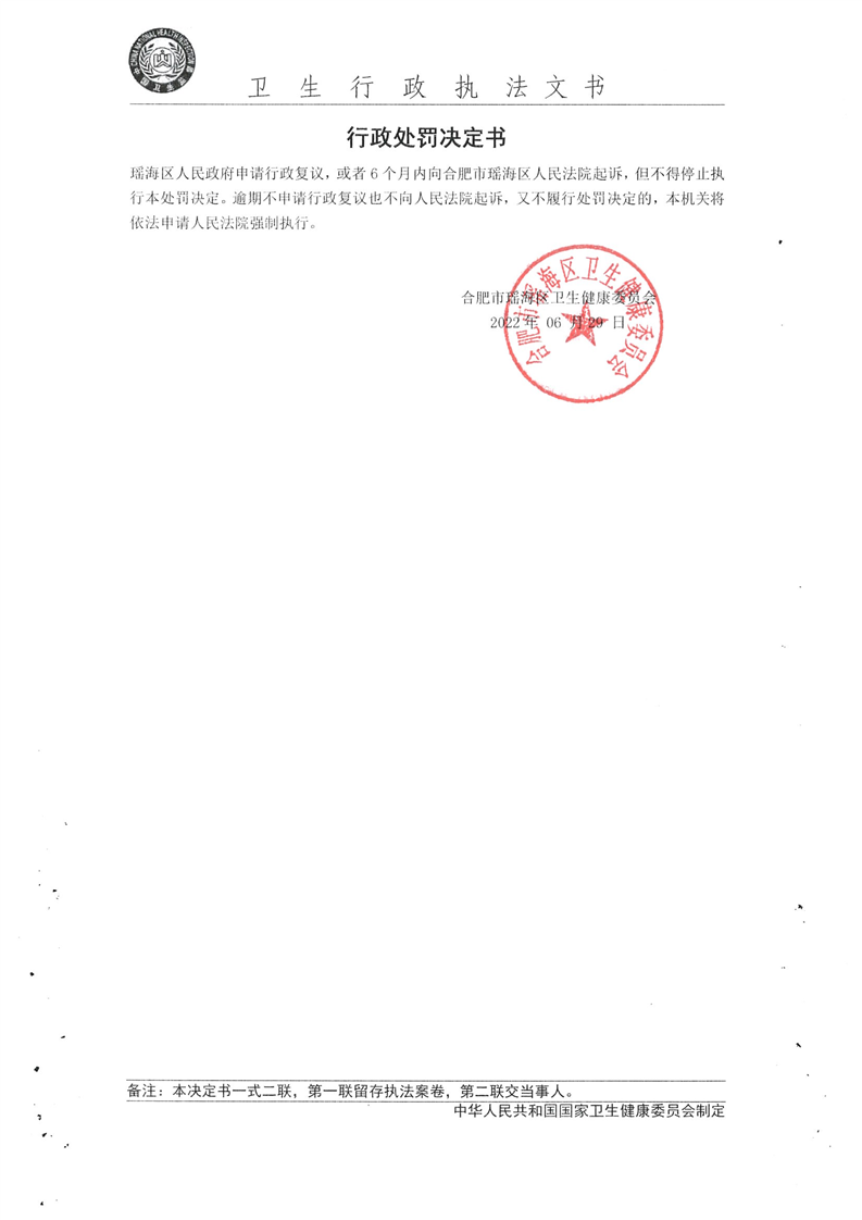 【行政处罚决定书】皖合瑶卫医罚〔2022〕7号 |