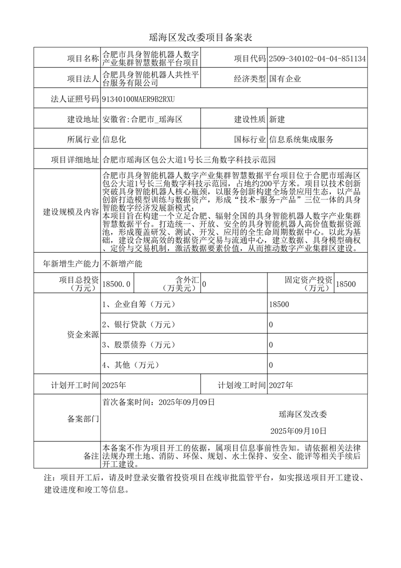 合肥市具身智能机器人数字产业集群智慧数据平台项目备案表 |