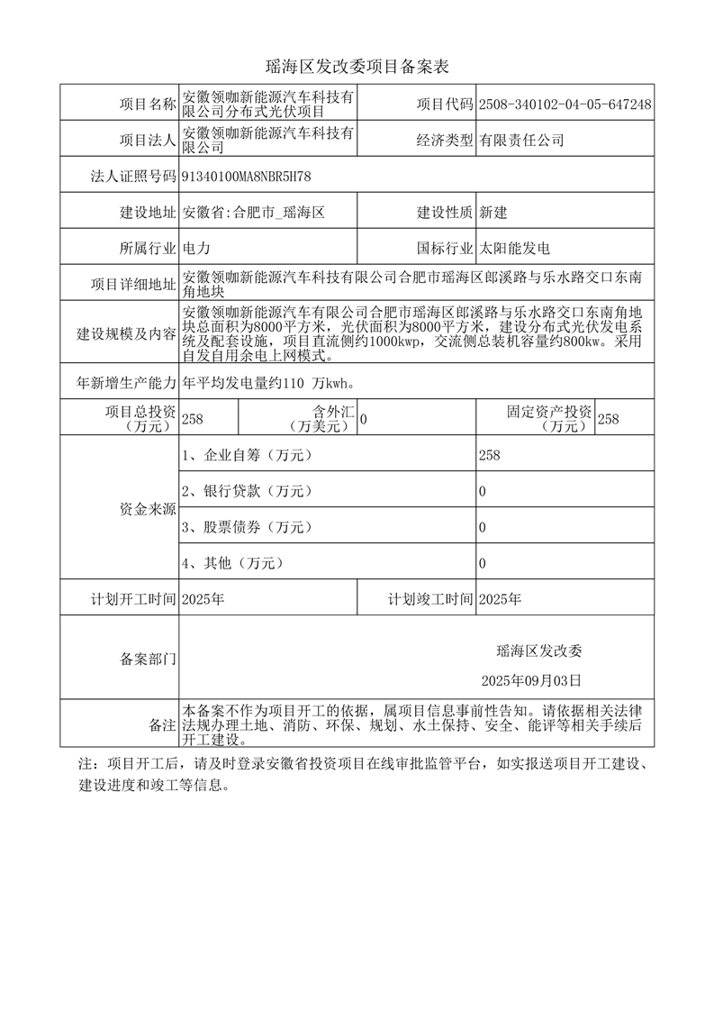 安徽领咖新能源汽车科技有限公司分布式光伏项目备案表