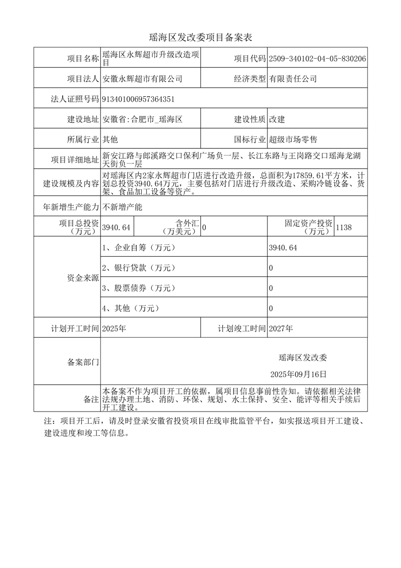 瑶海区永辉超市升级改造项目备案表 |
