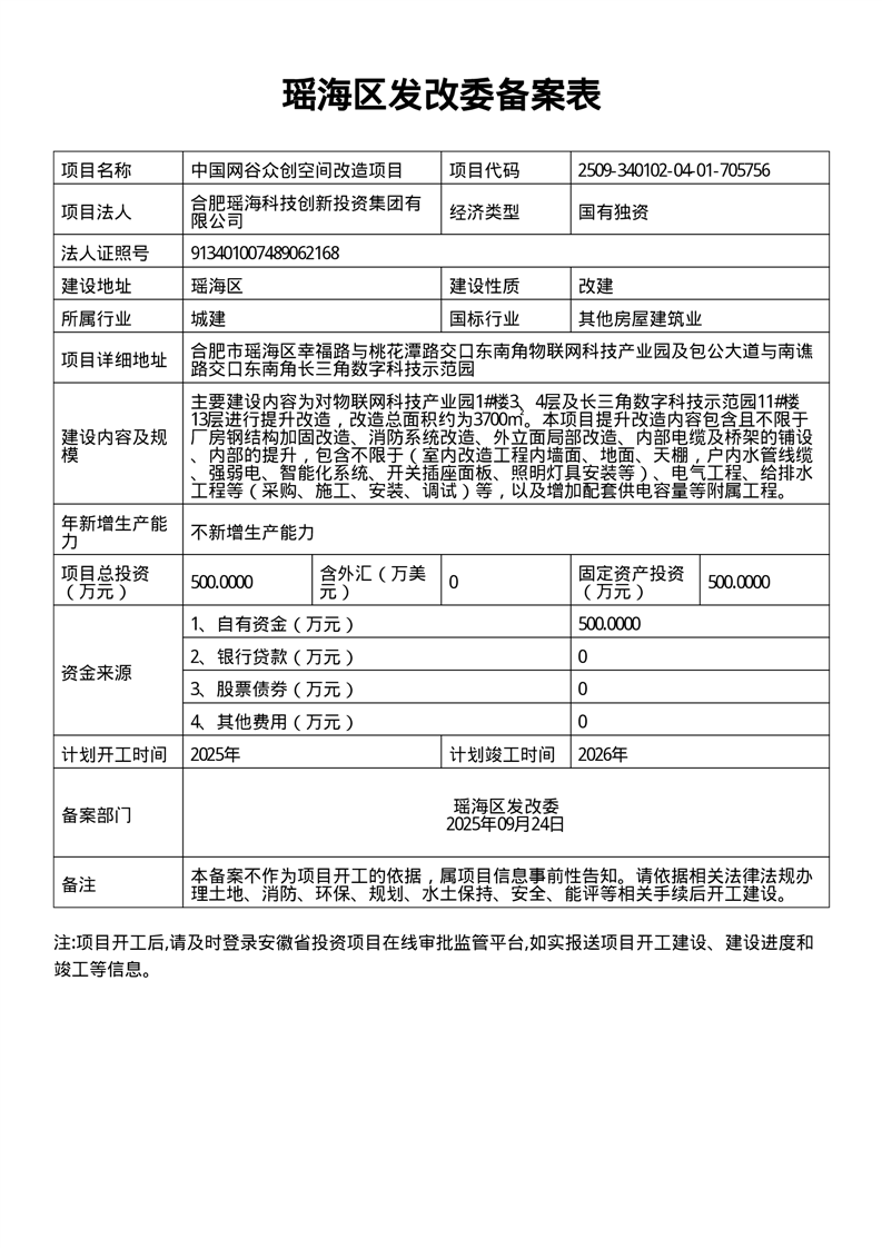 中国网谷众创空间改造项目备案表 |