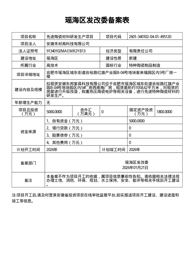 先进陶瓷材料研发生产项目