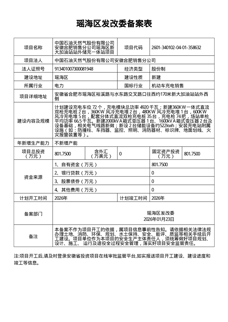 中国石油天然气股份有限公司安徽合肥销售分公司瑶海区新大加油站站外储充一体站项目 |