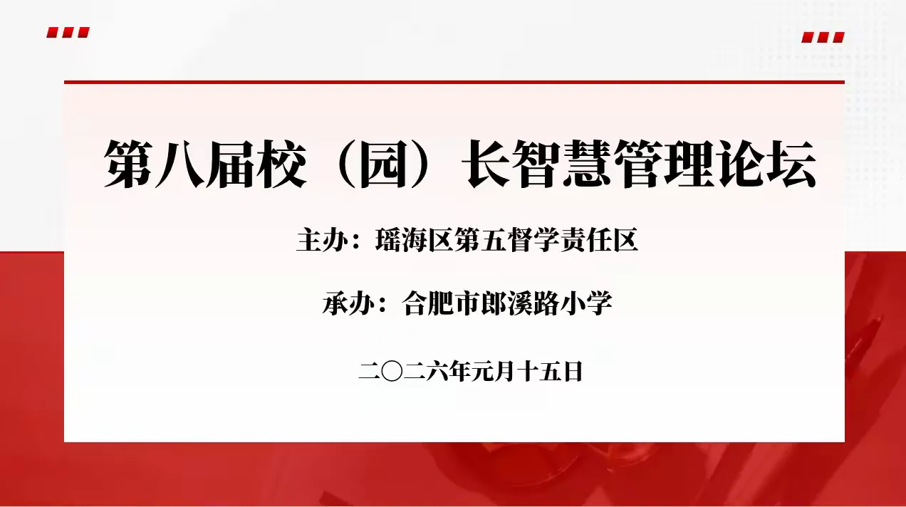 1月15日,瑶海区第五督学责任区主办的第八届校(园)长智慧管理论坛在合肥市郎溪路小学顺利举行。区教体局督导科、第五督学责任区督学、第五督学责任区中小学(含分校)校长及督导员、部分幼儿园园长等齐聚一堂,围绕“双减”背景下教育管理的创新路径与实践经验展开深入交流。