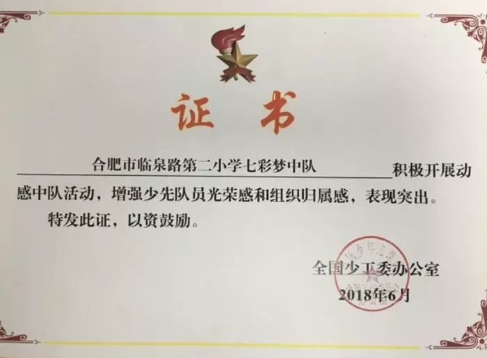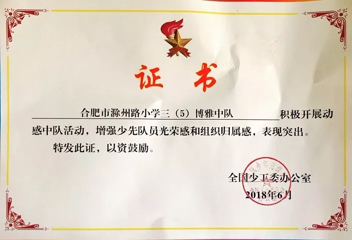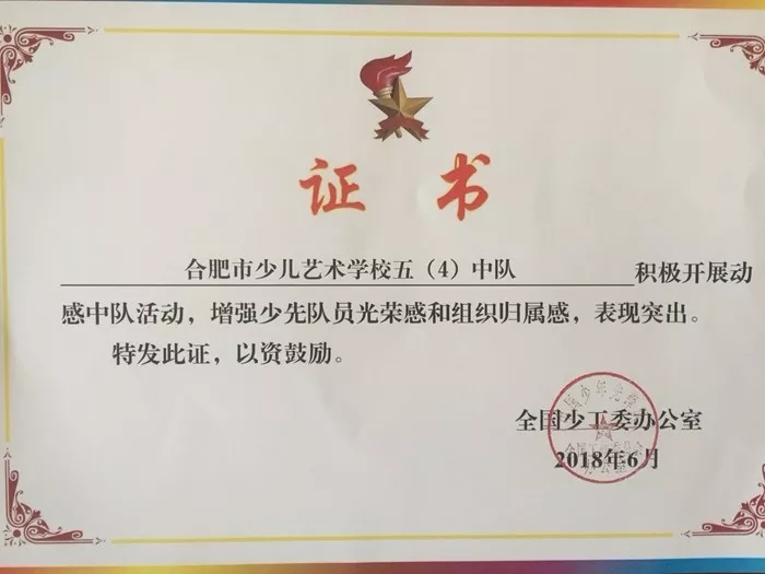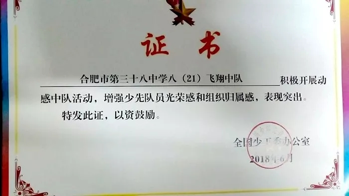 近日,有全国少工委评选的全国优秀“动感中队”名单出炉,瑶海区三十八中学八(21)班飞翔中队,合肥市少儿艺术学校五(4)中队、合肥市滁州路小学博雅中队、合肥市临泉路第二小学七彩梦中队4个中队榜上有名,荣获“全国动感中队”称号。