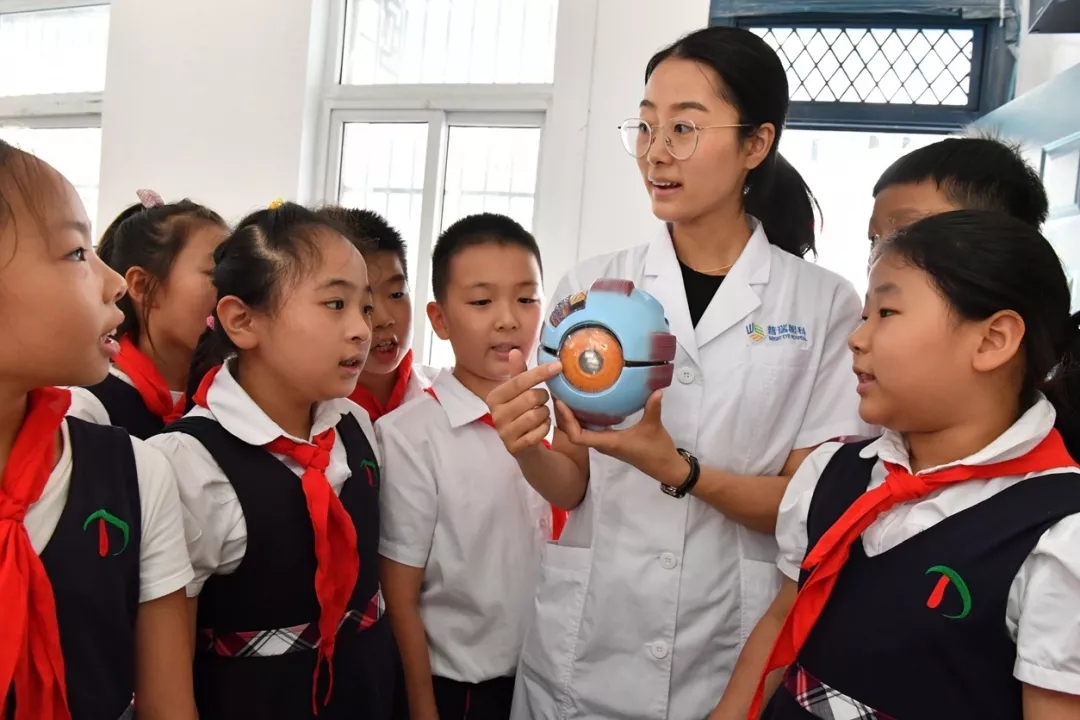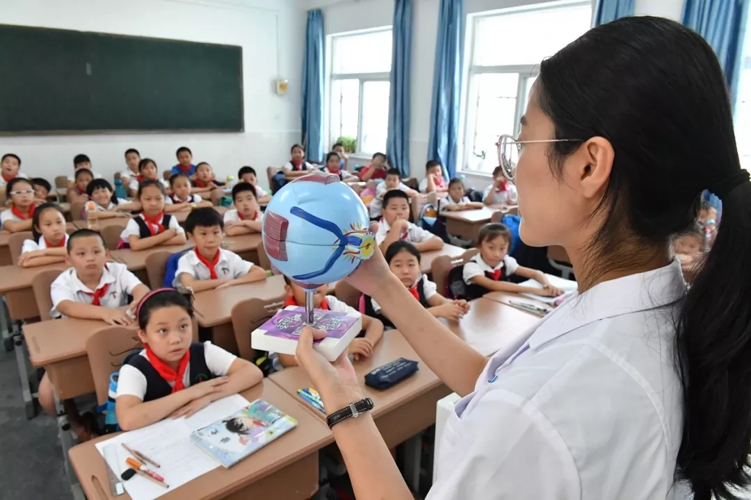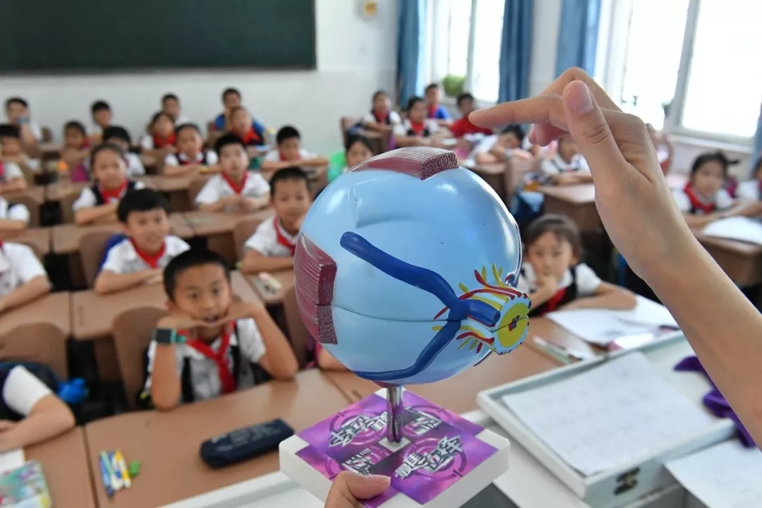 2018年9月5日,在合肥市大通路小学,专业眼科医师通过眼球构造模型为学生讲解爱眼护眼知识。